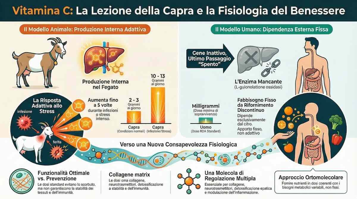 La capra non conosce linee guida alimentari, non prende integratori e non pianifica la propria nutrizione. Eppure regola perfettamente la vitamina C perché la considera una funzione metabolica essenziale. L’uomo ha perso questa funzione, ma non ha perso il bisogno biologico che la giustificava.