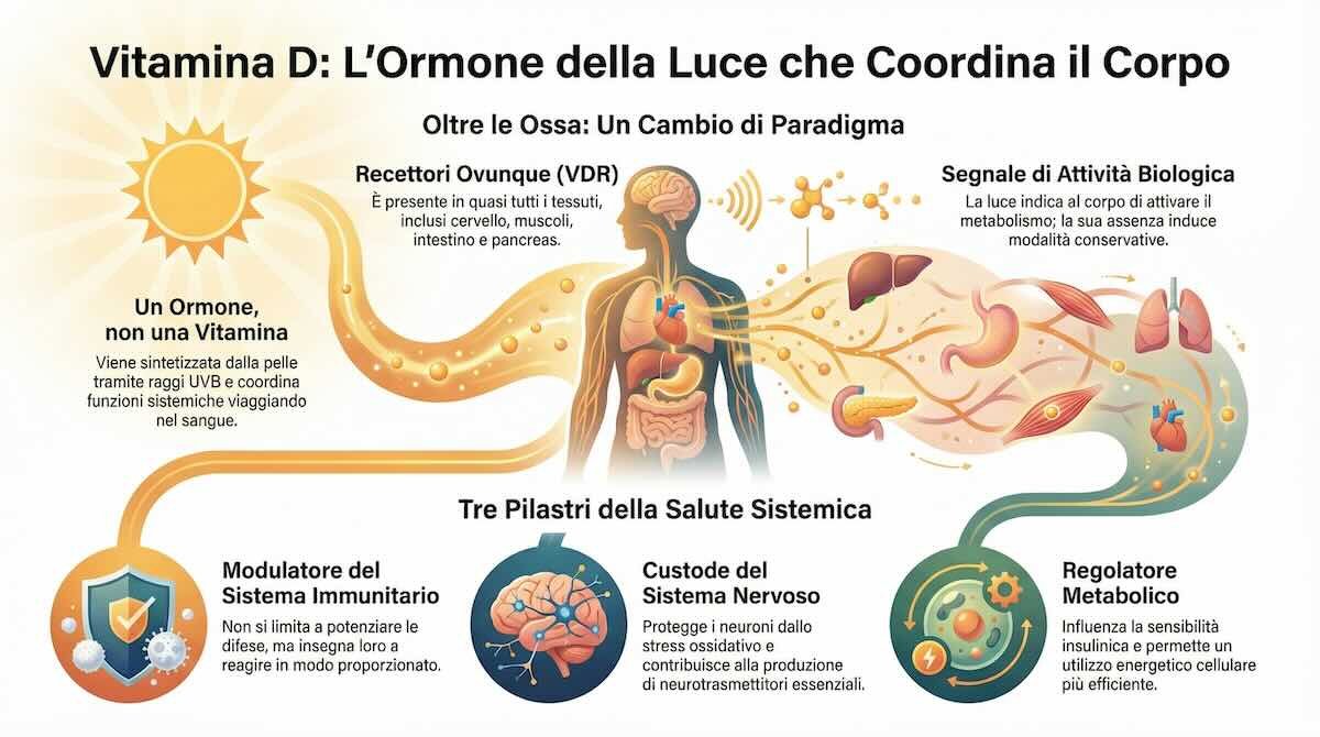 Chiamarla vitamina è utile, ma limitante. La vitamina D è un traduttore: converte un segnale ambientale in risposta biologica interna. Immunitaria, neurologica e metabolica. Permette alle capacità esistenti di funzionare in modo coerente.